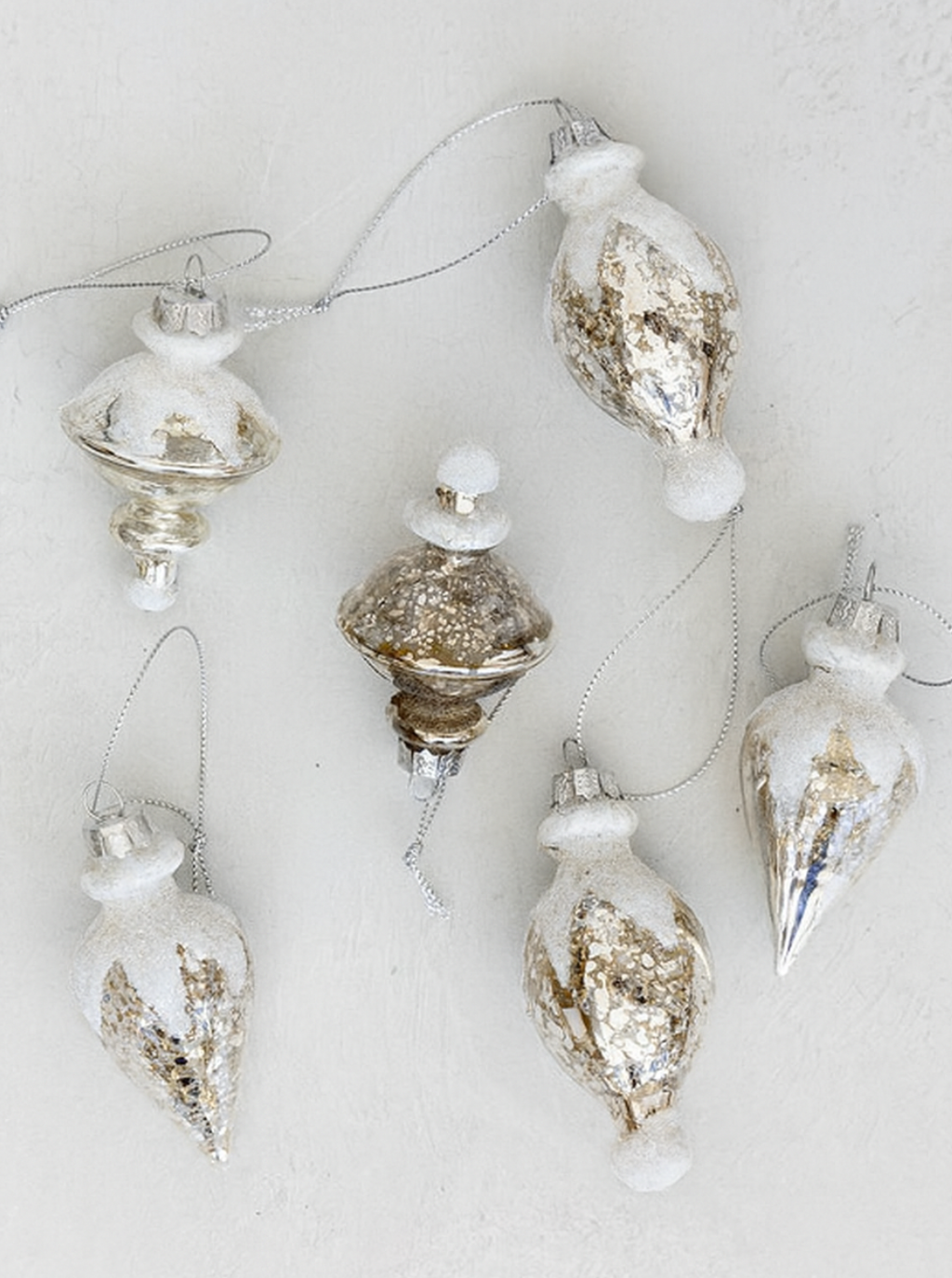 Adorn your holiday tree with these vintage-inspired antique silver ornaments. With a mixture of traditional shapes and a white glitter snow cap, these hand-crafted ornaments come with a string and loop ready to hang on your tree or gifts.