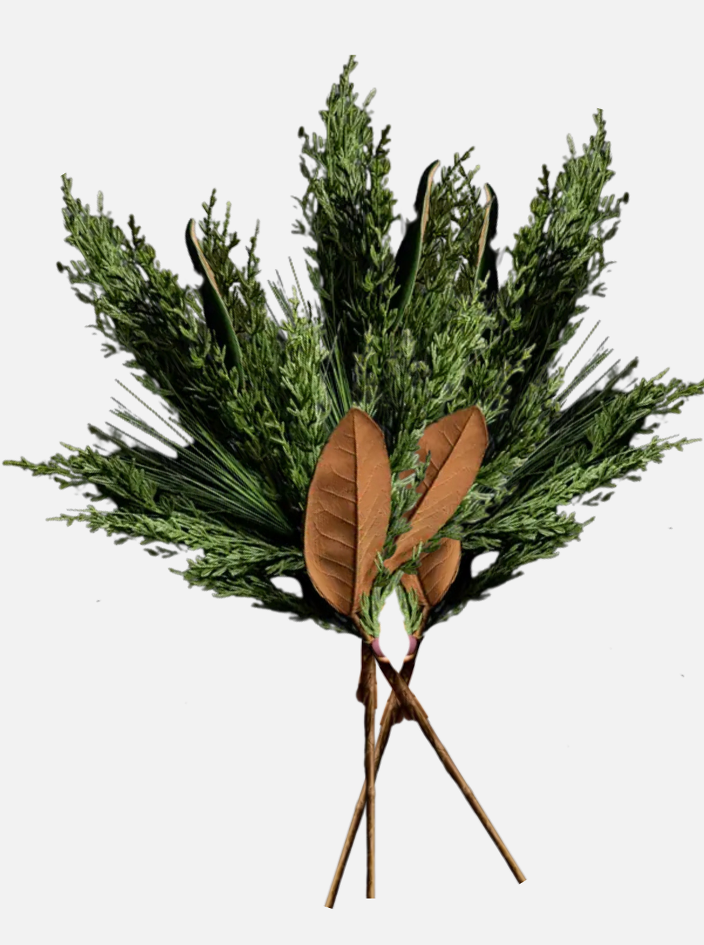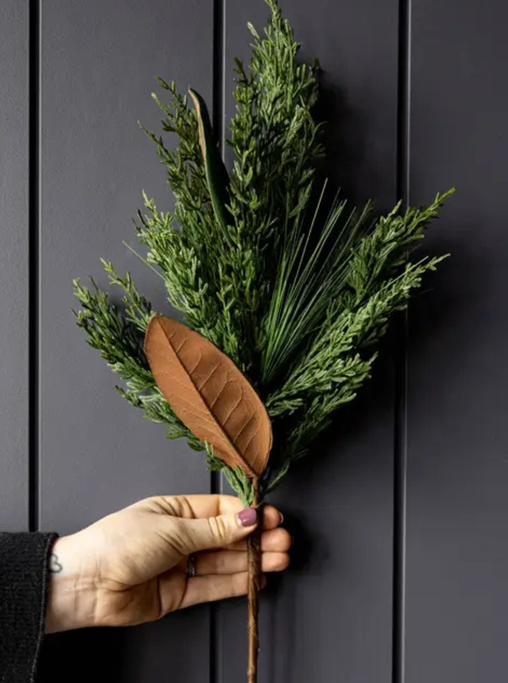 Add lush greenery to your seasonal arrangements with our Faux Magnolia Norfolk Stem. Featuring beautifully detailed Norfolk pine and magnolia leaves with warm brown backing, this realistic stem is perfect for styling in vases, garlands, or mantels. A timeless piece that blends effortlessly into your holiday displays year after year.