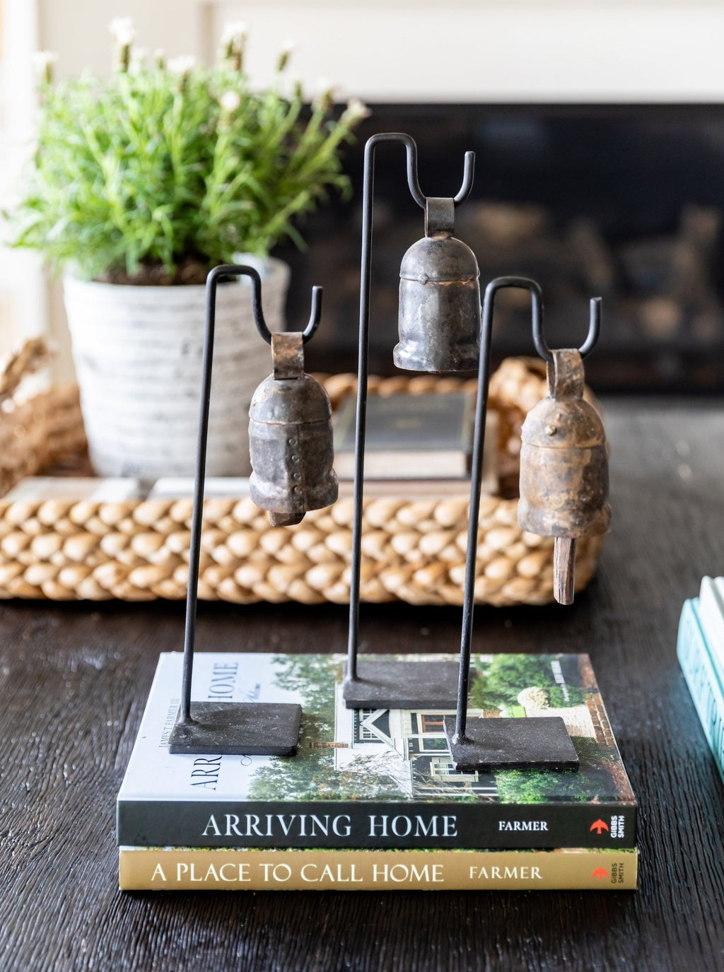 Fill your space with the soothing sounds of meditation and relaxation with these beautifully patina'ed vintage bells. Elegantly suspended from simple black metal stands at varying heights, this set offers a versatile styling element that brings a serene, timeless charm to any room.
