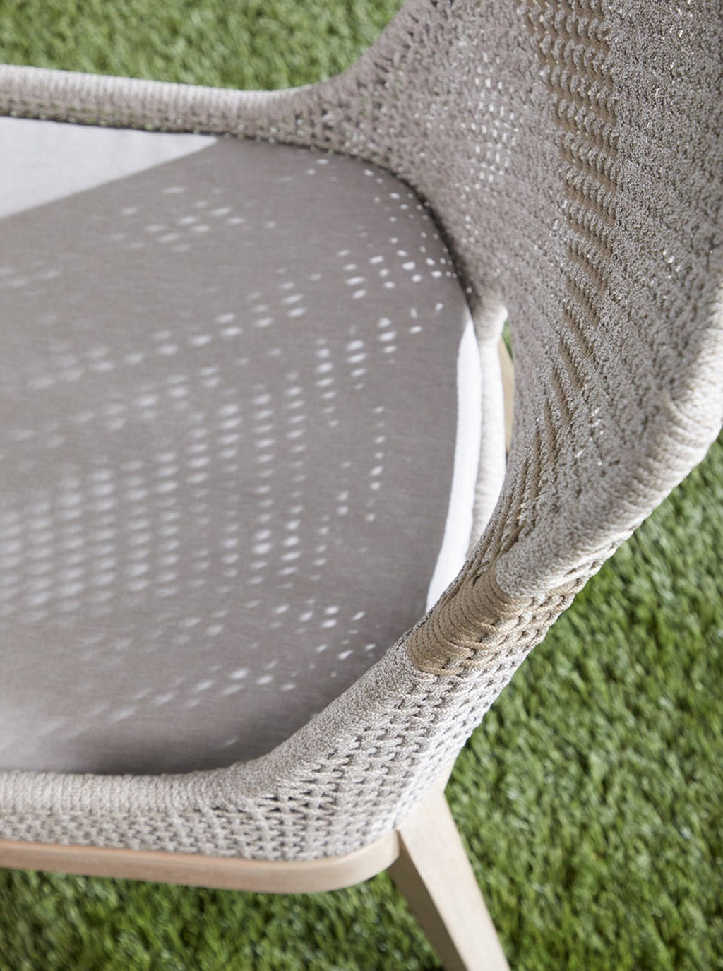 Interwoven rope atop a solid teak frame, this indoor/outdoor dining chair adds just the right amount of texture while remaining a comfortable place to sit.