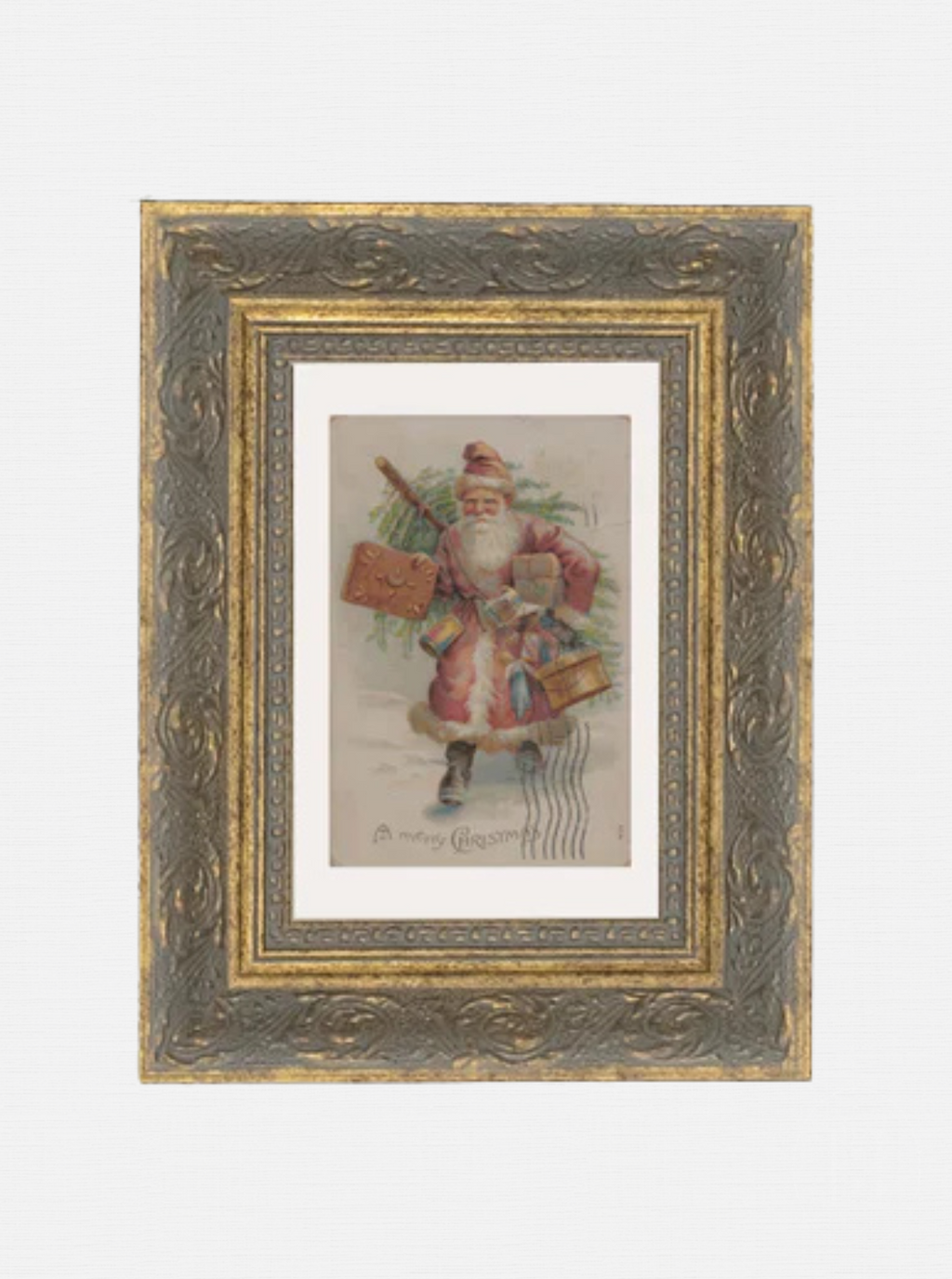 Framed in an embellished gold frame, Santa features a classic, old-time postcard depiction of Santa carrying a tree and a bounty of gifts. Full of nostalgia and holiday cheer, it’s a charming addition to seasonal displays, bringing warmth and festive spirit to your home.