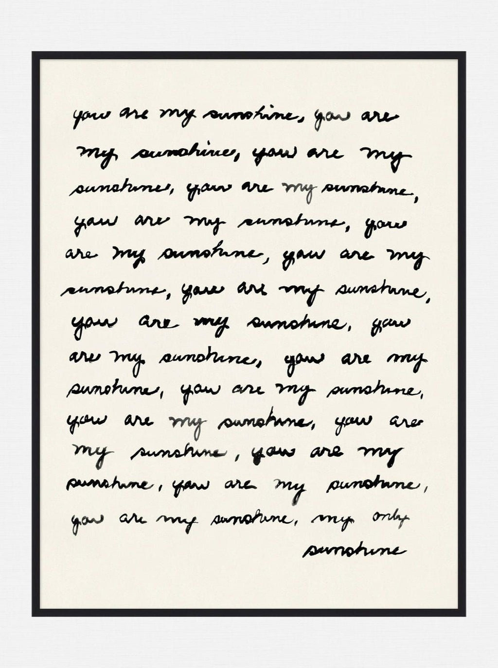 The lyrics to You Are My Sunshine in a hand-written script, this piece makes a statement of love in any space.